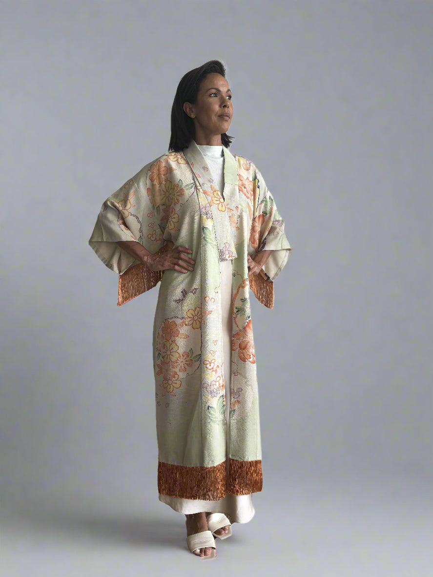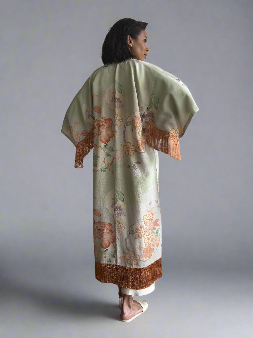 This kimono is made from vintage Japanese partially embroidered silk fabric, adorned with silky fringe tassels on sleeves and hem giving it a roaring 20s vibe.
