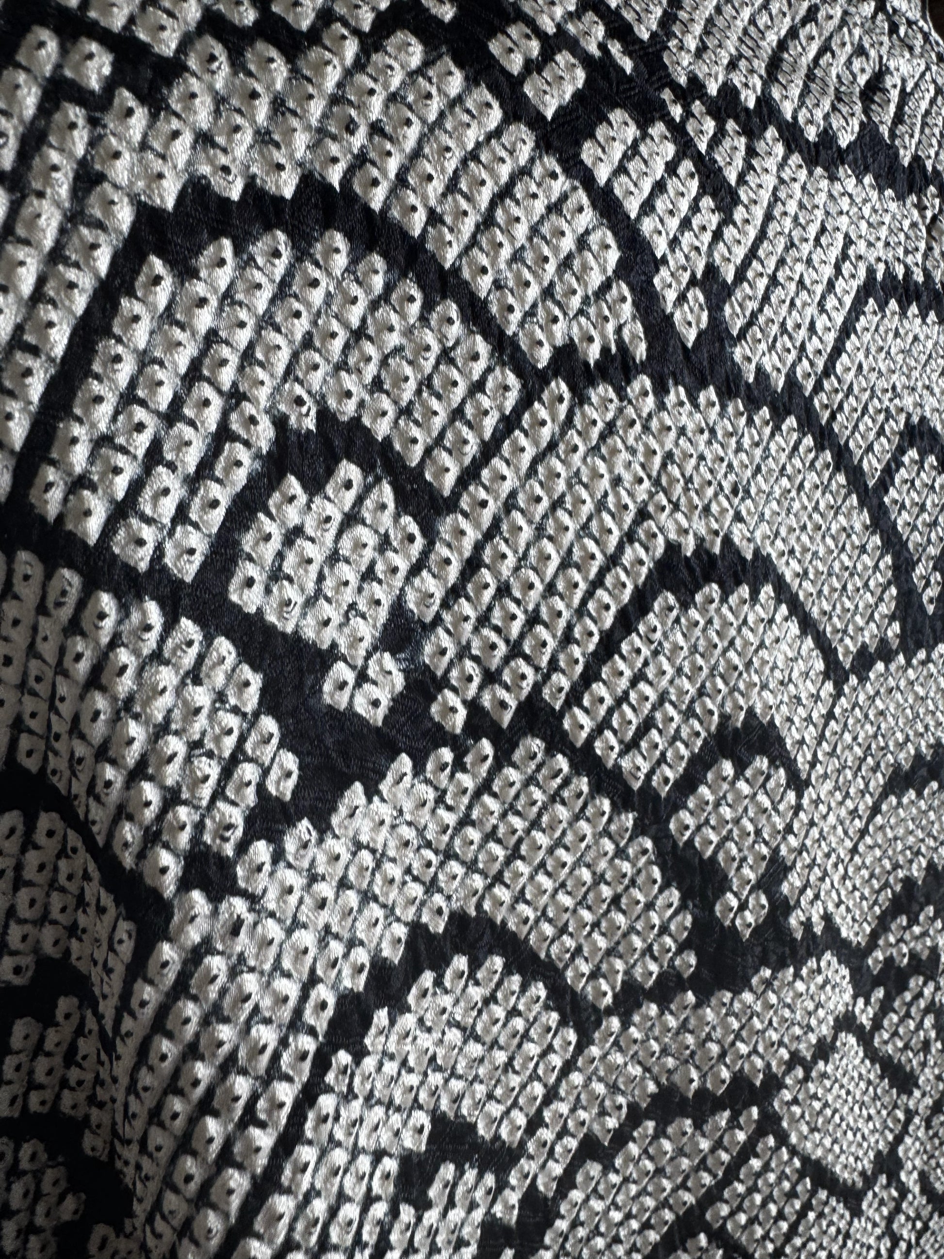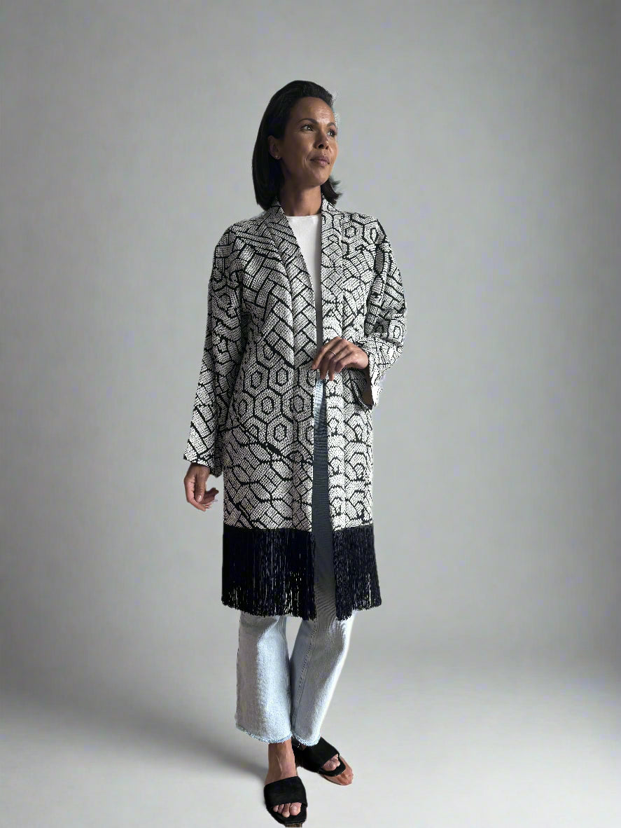 This striking long haori, crafted from 100% silk shibori fabric, features a bold black-and-white geometric pattern with intricate hexagonal and lattice designs. The shibori technique, a traditional Japanese method of resist dyeing, creates a textured, tie-dye effect that adds depth and uniqueness to the piece. Finished with a dramatic fringe at the hem, this upcycled masterpiece from Nanami Reborn blends heritage craftsmanship with modern flair, symbolizing resilience and artistic renewal.