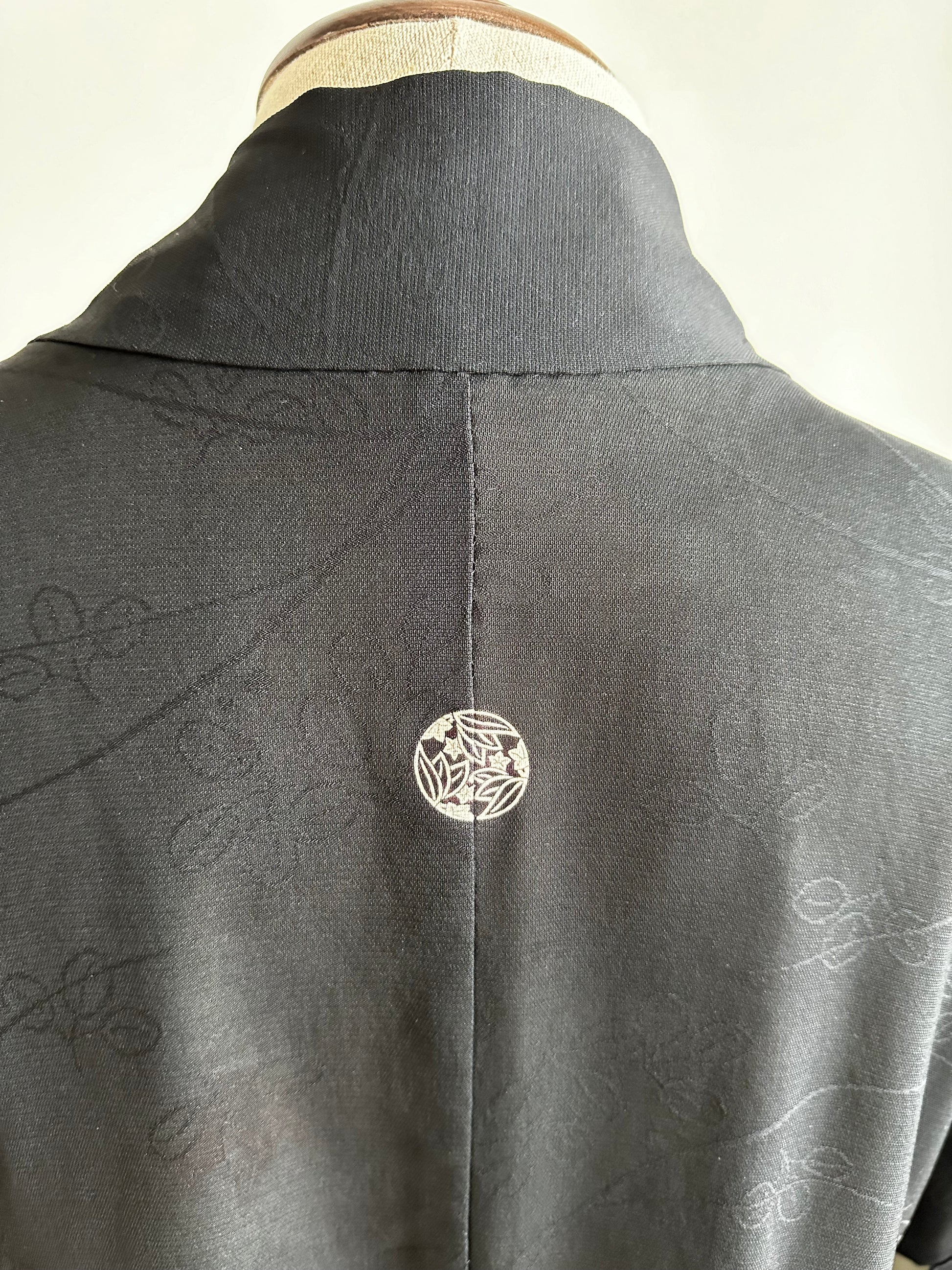 This reversible black kimono exudes 1920s-inspired elegance, blending vintage charm with cultural artistry. Adorned with a delicate fringe at the hem, it features hand-painted artwork.